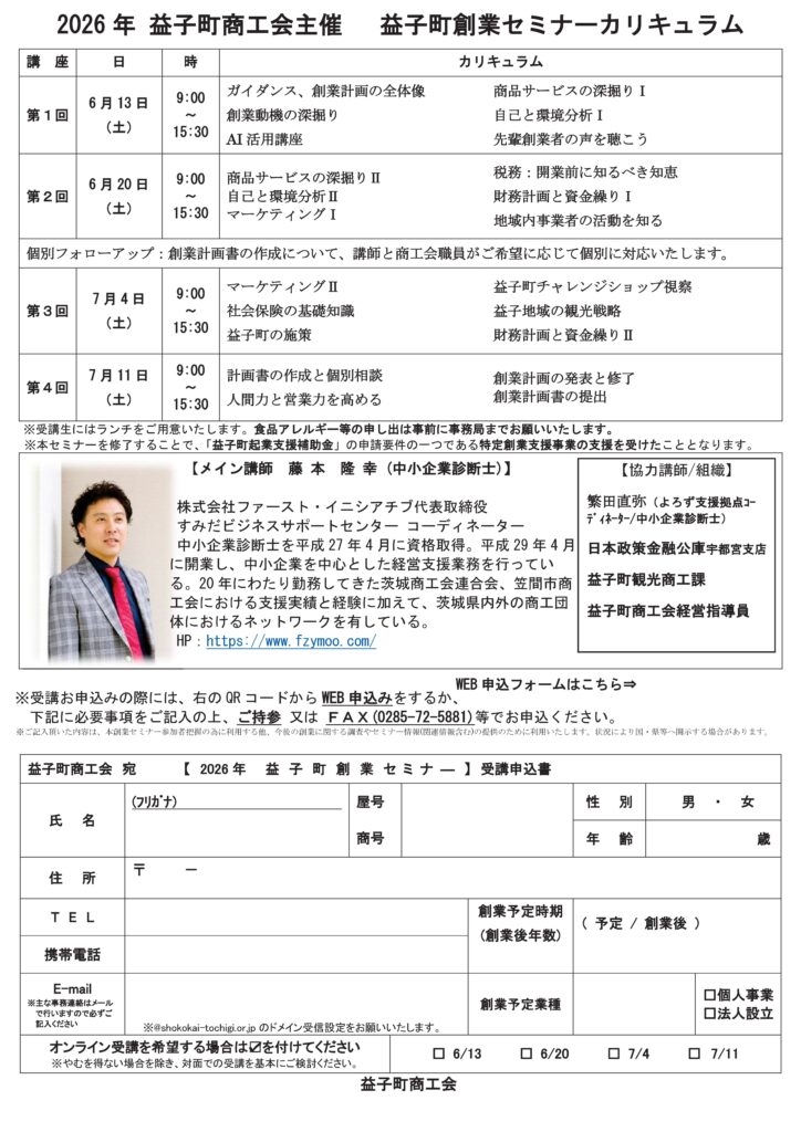 益子町での創業をお考えの皆様、ぜひこのセミナーを受講して、しっかりと準備をし、夢を現実にしてください!